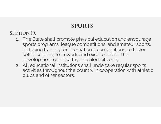 1 the state shall promote physical education and encourage sports programs league competitions and amateur sports including training for international competitions to foster self discipline teamwork and excellence for the development of a healthy and alert citizenry. Among these are. Article 14 section 19 of the philippine constitution 1 the state shall promote physical education and encourage sports programs league competitions and amateur sports including training for.