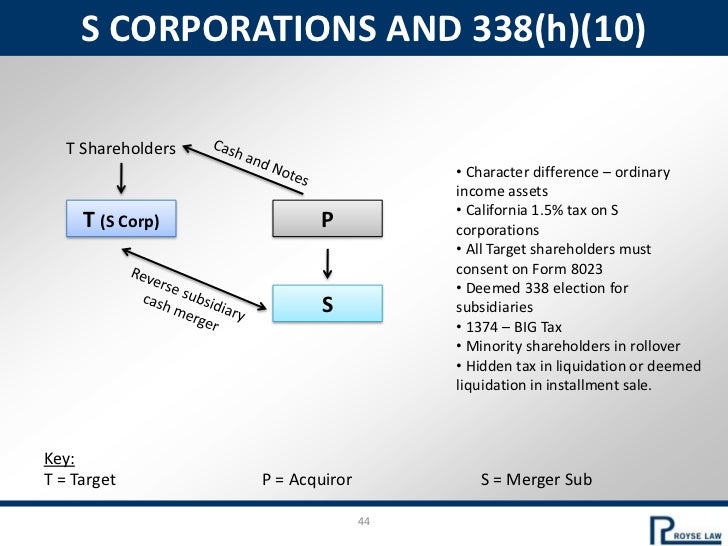 In this regard if stock of a purported s corporation is purchased in a qualified stock purchase qsp it is critical to ascertain that the target corporation has a valid s election in effect at the time of acquisition if a section 338 h 10 election is intended. Benefits and risks of a section 338 h 10 election. S corporations and section 338 h 10 if the target is an s corporation and a stock purchase is desired for non tax reasons but an asset purchase is desired for tax reasons it is common for the target s corporation s shareholders and the acquiring corporation to agree to make an election under section 338 h 10.