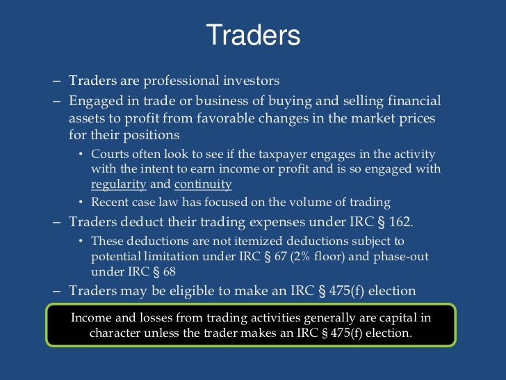 If a trader makes that election the gains or losses are treated as ordinary and not capital thus no 3 000 per year limit is imposed on deducting the losses. Section 475 f provides that a trader in securities or commodities can make elections to mark to market their securities and or commodities and treat increases or decreases in value as ordinary.
